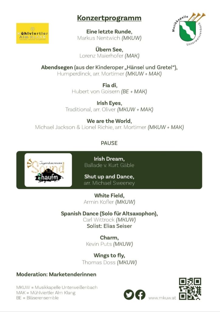Das diesjährige Konzert findet in Kooperation mit dem Mühlviertler Alm Klang Chor statt. Neben gemeinsam gestalteten Liedern wird sowohl die Musikkapelle als auch der Chor jeweils alleine auftreten.