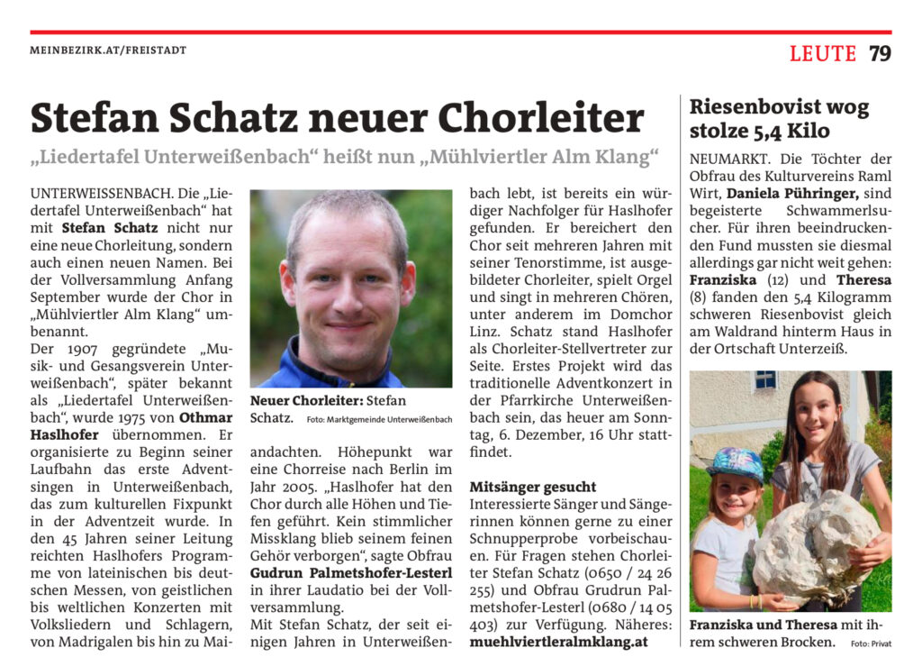 Bezirksrundschau Pressetext Stefan Schatz25. September 202017. März 2023 Ein Artikel von der Entstehung des Mühlviertler Alm Klang wurde in der Bezirksrundschau veröffentlicht. 25.09.2020 Pressetext in der Bezirksrundschau Nr. 39 – Stefan Schatz neuer Chorleiter